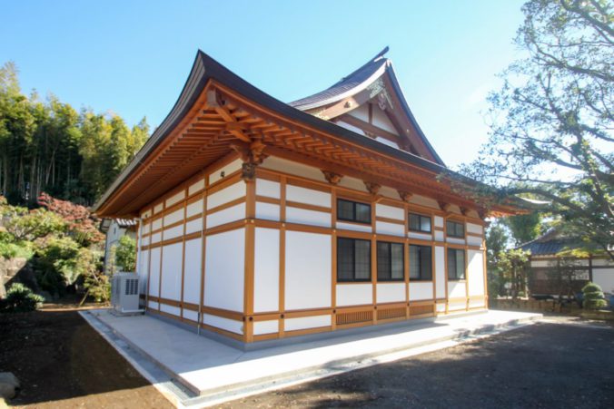 横浜市旭区において本立寺様本堂を新築させていただきました。長年培われてきた寺社仏閣建築の技術を活かし、弊社で素材の選定、集積から始まり、建てる前は約1年の加工の準備期間をかけ、立派な本堂が完成しました。使われる主な木材はケヤキ、ヒノキ材になります。