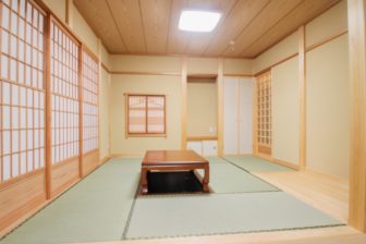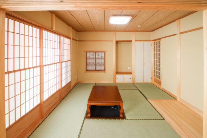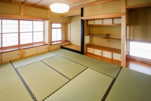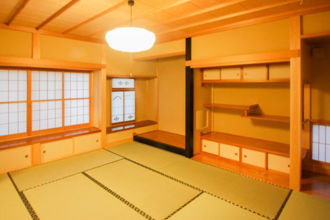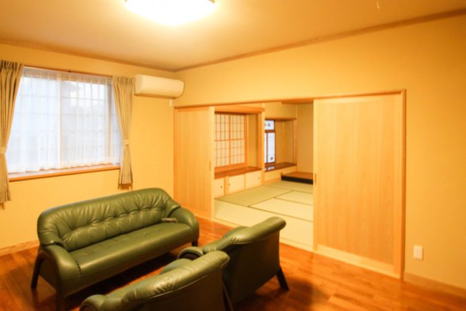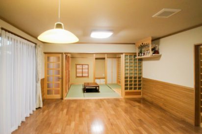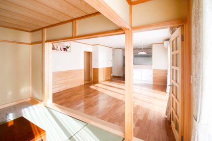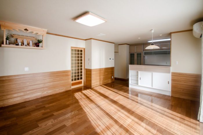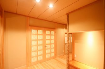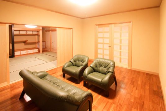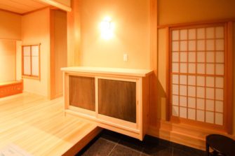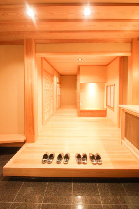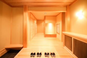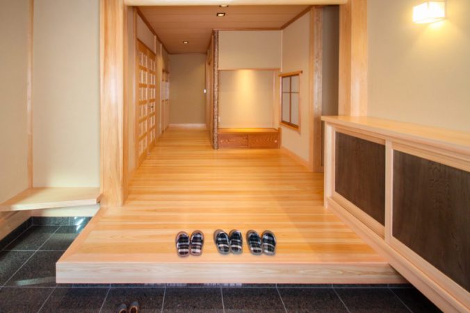 銘木や珪藻土等、自然素材を内装にふんだんに用い、どの部屋にいてもやさしい、温もりのある空間になりました。玄関戸を開けると旅館に来たと思わせるような広い玄関と、御影石の床、真壁造りの木をあらわした落ち着きのある癒やしの空間が広がります。
