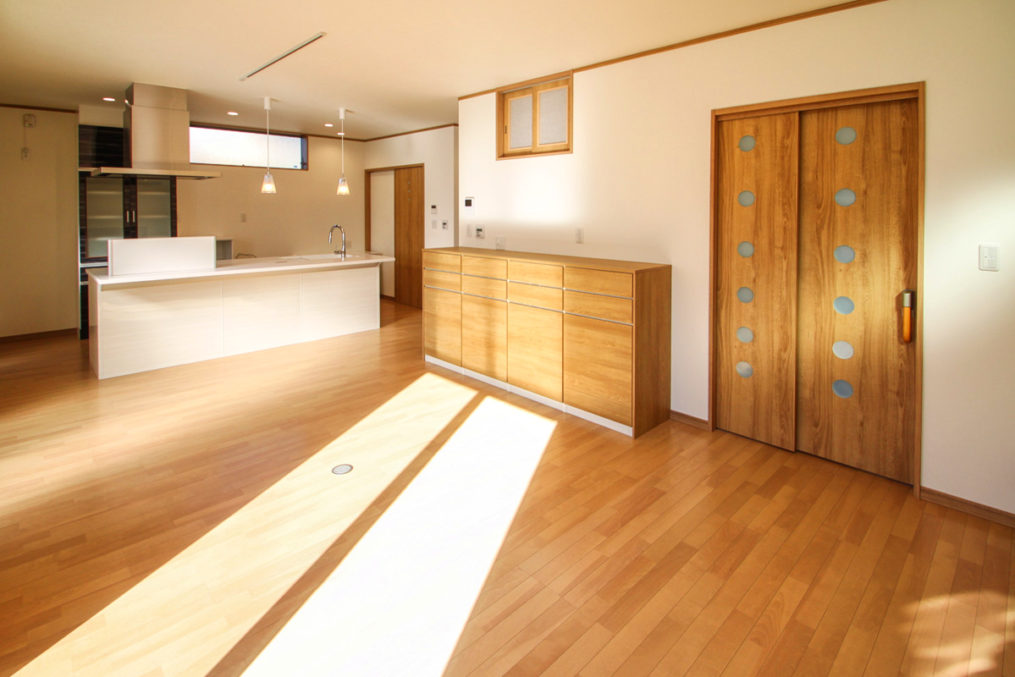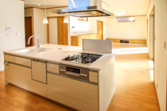 リビング・ダイニング・キッチンといった、家族が一緒に過ごす場所は一体的な空間にしています。そこに多目的に使えるタタミコーナー、南面にウッドデッキ、家事動線を考慮した物干し・洗濯場として使えるサンルームも隣接し、LDKを中心に家事と暮らしを楽しめる間取りになりました。キッチンはアイランド型とし、家族のみなさんで料理を楽しみながら、リビングを見渡せ、料理中も家族との会話も楽しめます。