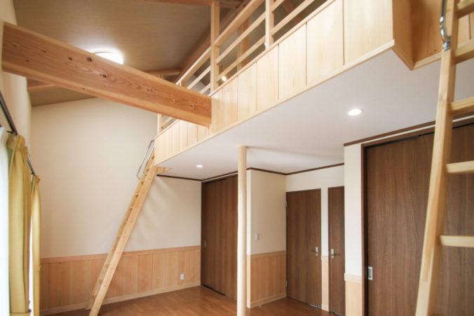 子供部屋は成長に応じて区画し、巣立った際に戻せる可変性を考えたつくりになっています。また、ロフトを設け空間の広がりと共に、スペースに余裕を持たせています。