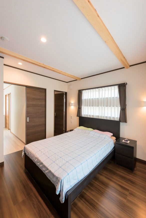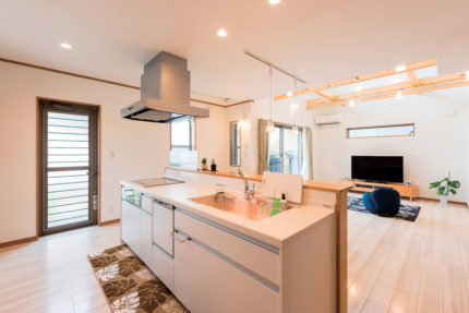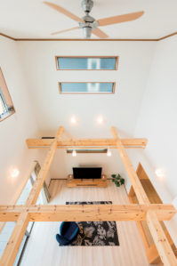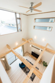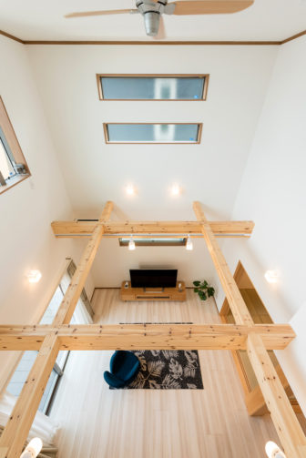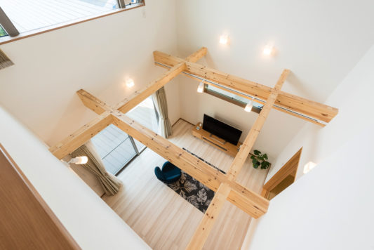 リビングは白を基調にした明るい空間。吹き抜けは「梁」をアクセントにし空間に変化をもたせています。室内は「木」のやさしさいっぱいの癒やしあるナチュラルテイストです。