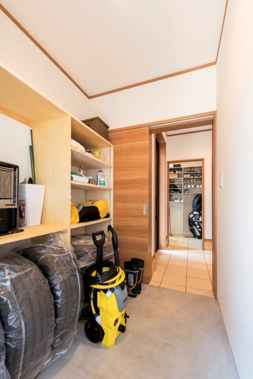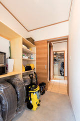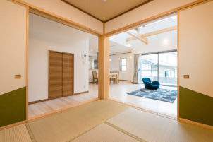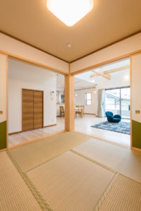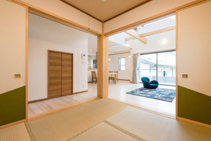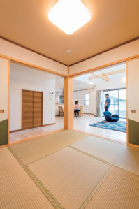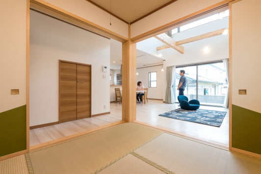 一年ほどかけてじっくりと練ったプランは「大きな吹き抜けのある開放感ある住まい」。間取りは家中行き止まりが無いのではと思えるほどの回遊性。これだけの大空間を実現していながら、室内は四季を通して快適な温度と湿度を保ちます。電気を使わない湿気対策で光熱費も節約でき省エネ効果も実感して頂いております。