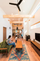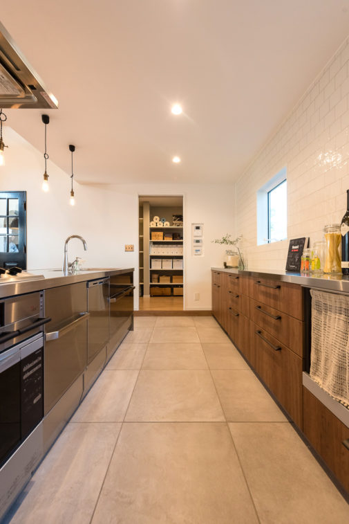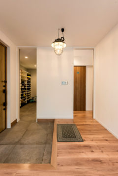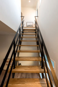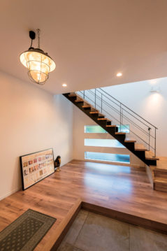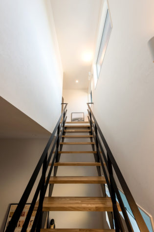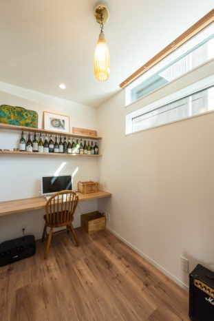 この家の南側には三階建の建物があり、明るいリビングを実現する為に2階をリビングに。キッチンは友人達との会話を楽しみながら食事出来るようにオープンにしながら、冷蔵庫等の家電製品は視界に入らない工夫もしました。シンプルだがこだわりやアイデアがいっぱい。お客様のセンスでインテリアを作り込んでいく楽しみがあります。