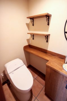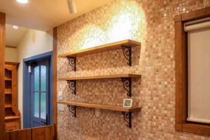 無垢の厚板カウンター選びには、オーナーさんにもご一緒に工場見学していただき素材の選定をしました。内装の木の素材感、左官の壁、テラコッタタイルの床との調和のとれたバランスは、ゆったりと落ち着ける心地よい空間となりました。温かく優しいスタッフさんの入れる美味しいコーヒーや、フランス伝統菓子、ガレットなど軽いお食事も楽しめます。テイクアウトでご注文のケーキも承ってくれるようです。店名の「chez moi」(シェ・モア)はフランス語で「わたしの家で」と言う意味とのこと。とてもくつろげるお店で美味しいカフェタイムは最高です。是非一度ご来店いただきたいと思います。