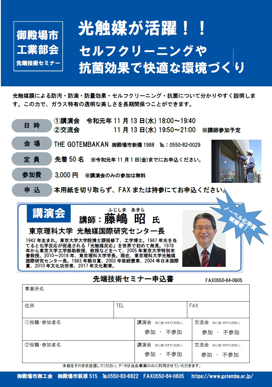 御殿場市商工会工業部会主催の先端技術セミナーが、11月13日(水)18:00よりTHE GOTEMBAKANにて行われます。